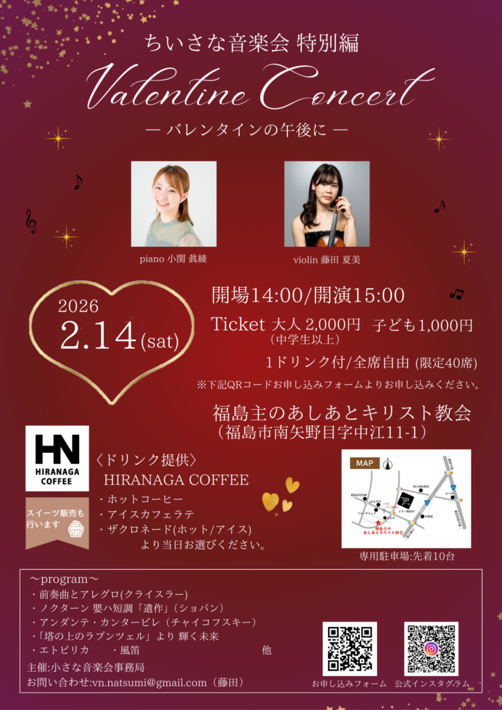 【開催済み】2026年2月14日 ちいさな音楽会〜特別編〜 Valentine Concert